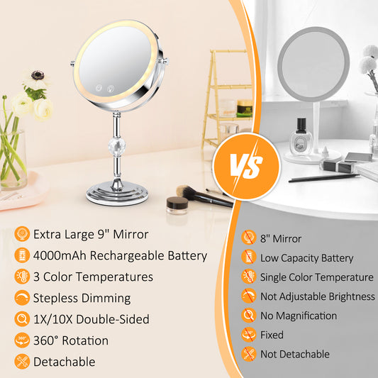 9" Double Sided Lighted Makeup Mirror with Stand, 1X/10X Magnification Vanity Mirror with 3 Colors Stepless Dimming, Portable & Rechargeable Touch Control 360°Swivel Light Up Mirror, Women Gift