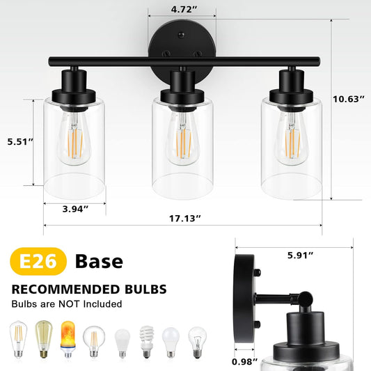 Unicozin 3 Light Vanity Lights, Black Wall Sconce Light with Clear Glass, Bathroom Light Fixtures, Wall Lights for Mirror, Living Room, Bedroom, Hallway, E26 Base (Bulbs Not Included)