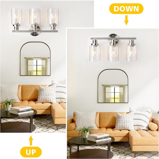 Unicozin 3 Light Vanity Lights, Matt Nickel Wall Sconce Light with Clear Glass, Bathroom Light Fixtures, Wall Lights for Mirror, Living Room, Bedroom, Hallway, E26 Base (Bulbs Not Included)