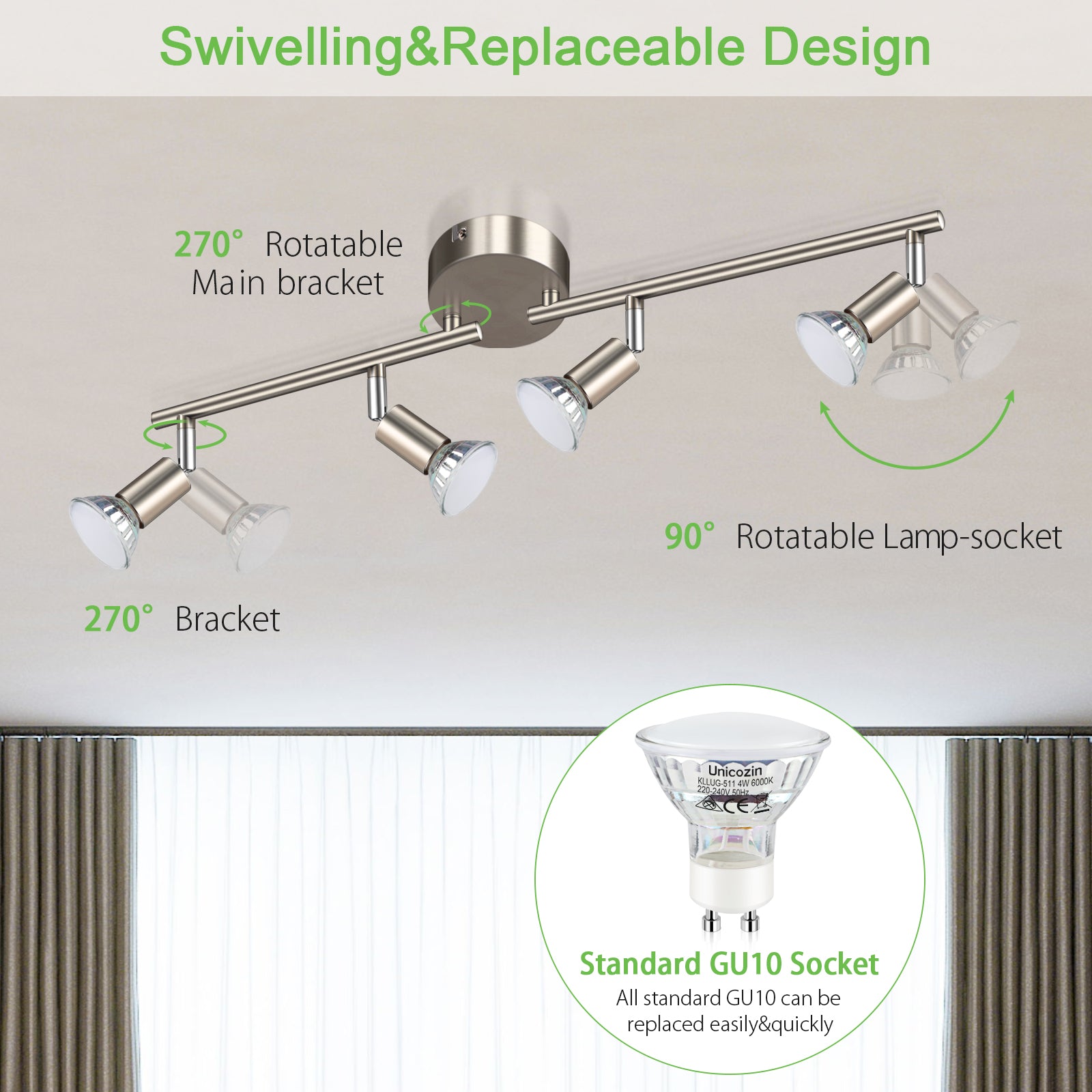 Unicozin LED Ceiling Light Rotatable, 4 Way LED Ceiling Spotlight, Matt Nickel & Swivelling Design, Including 4 X 4W GU10 LED Bulbs (450LM, Cool White 6000K),for Kitchen, Living Room, Bedroom, AC220-240V