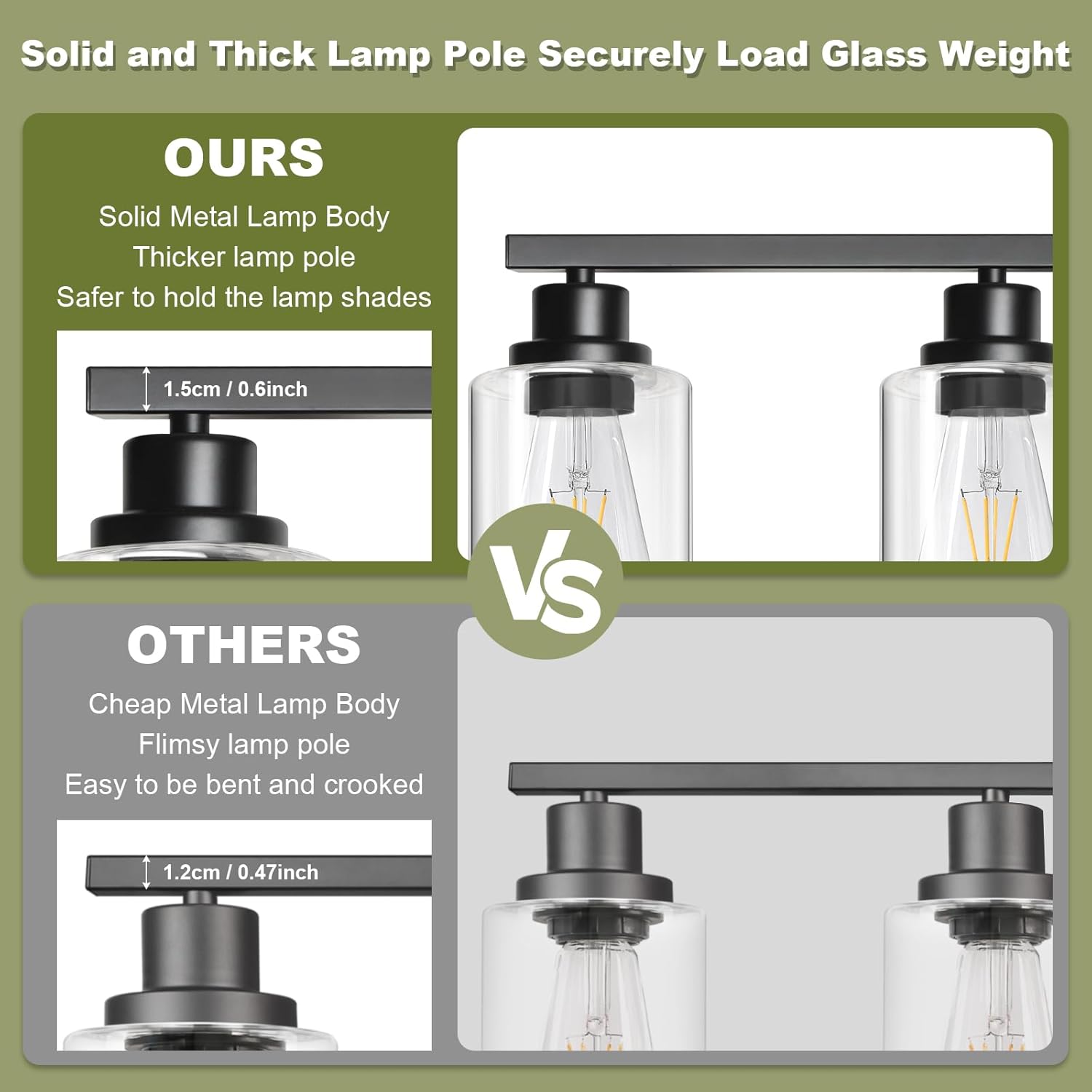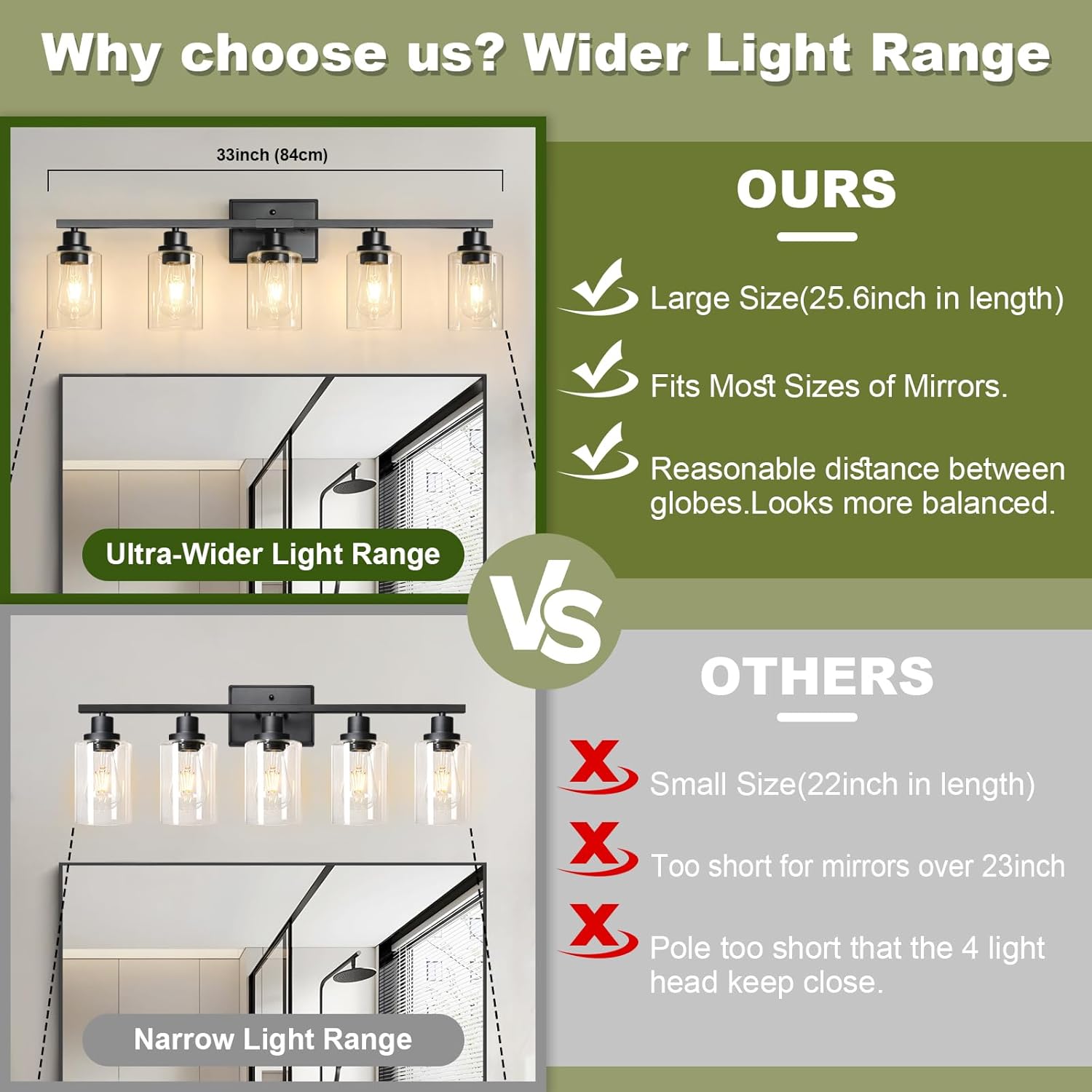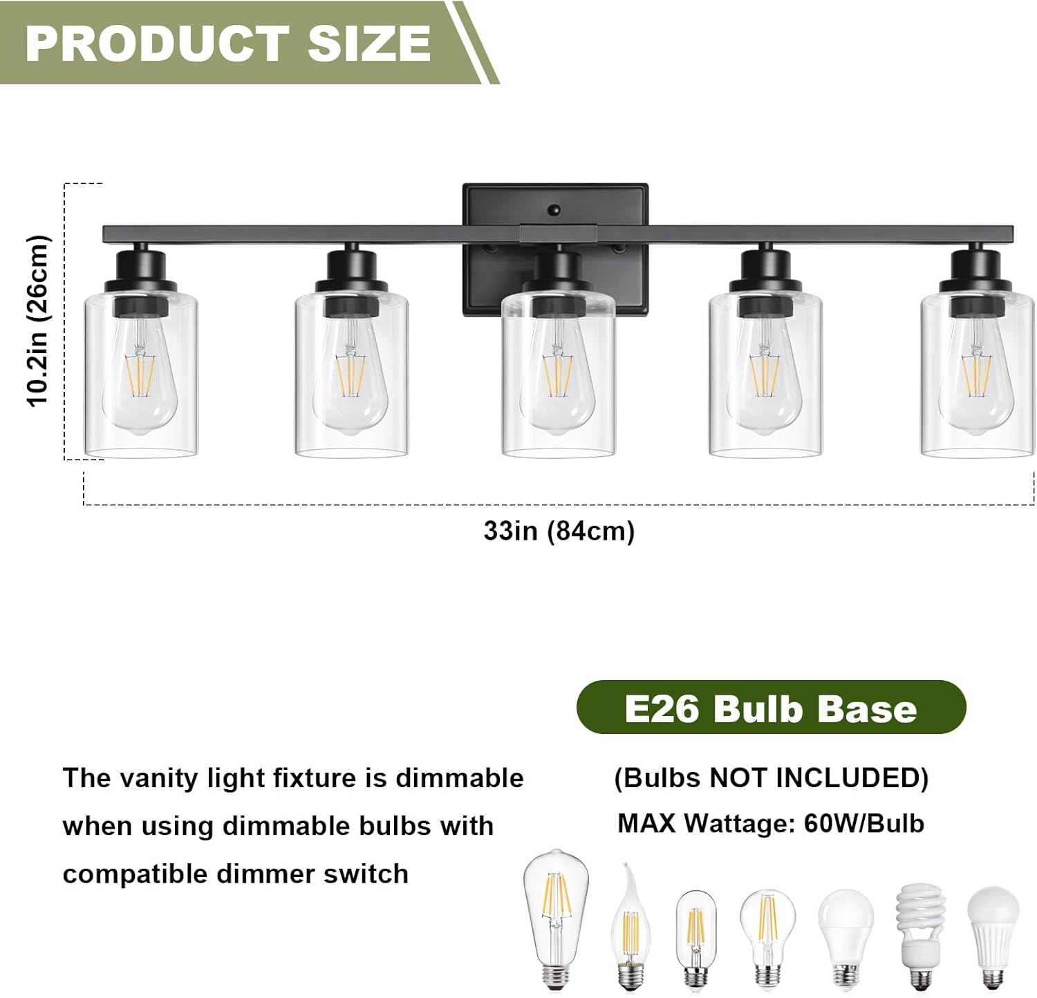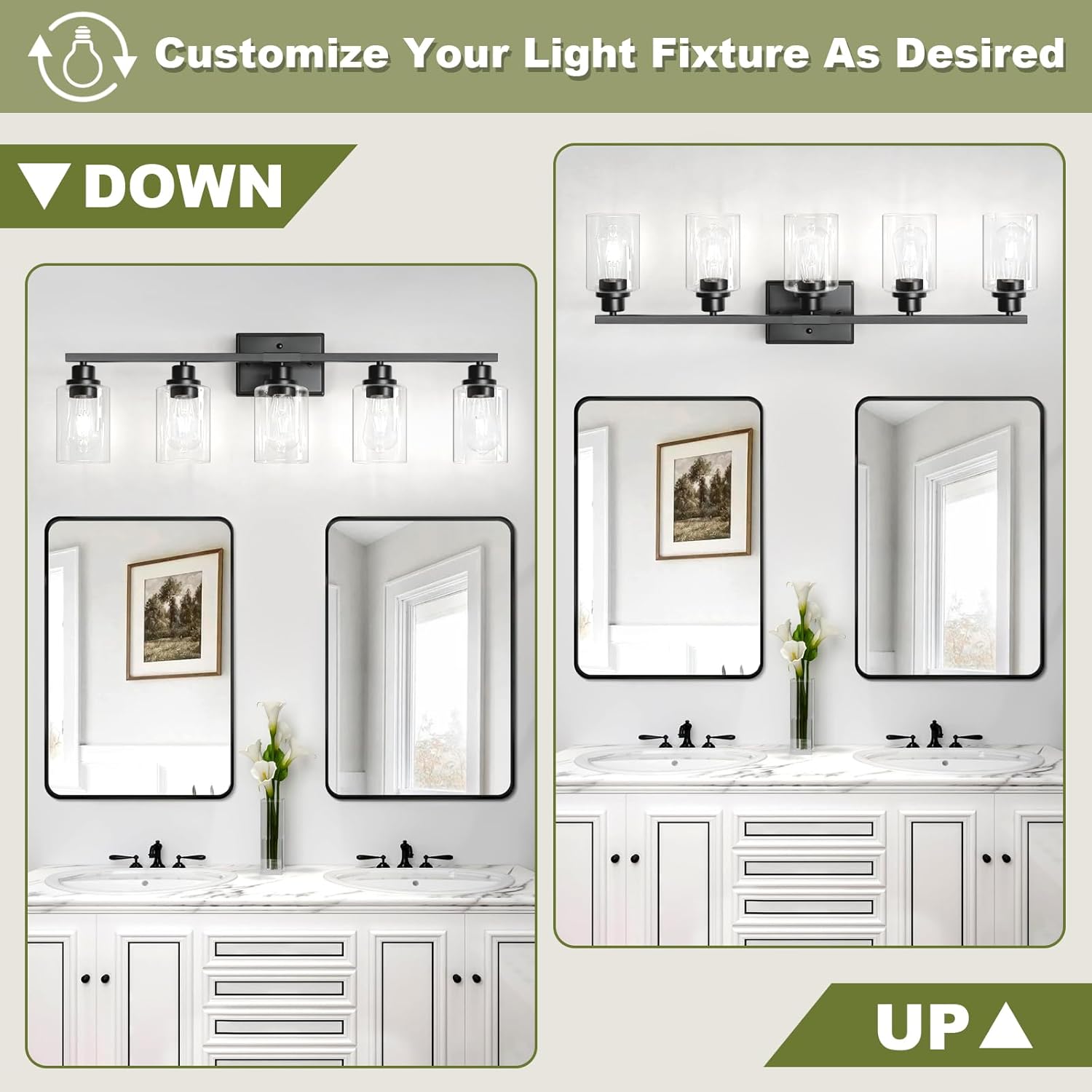 Modern Minimalist Design: This 5-light bathroom light fixture features matte black finish lamp frame and clear glass shades,which is suitable for various decoration styles. A perfect choice to enhance aesthetics for bathroom remodel.